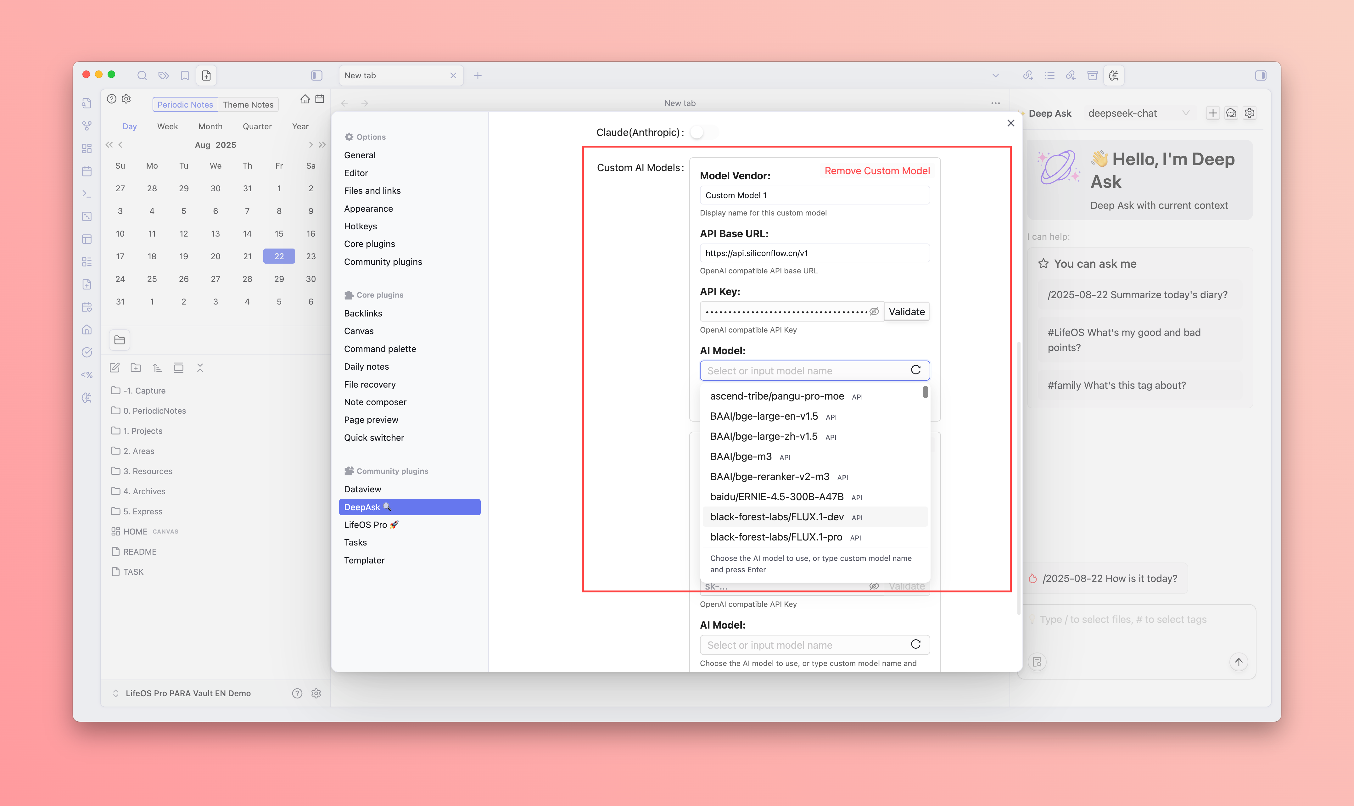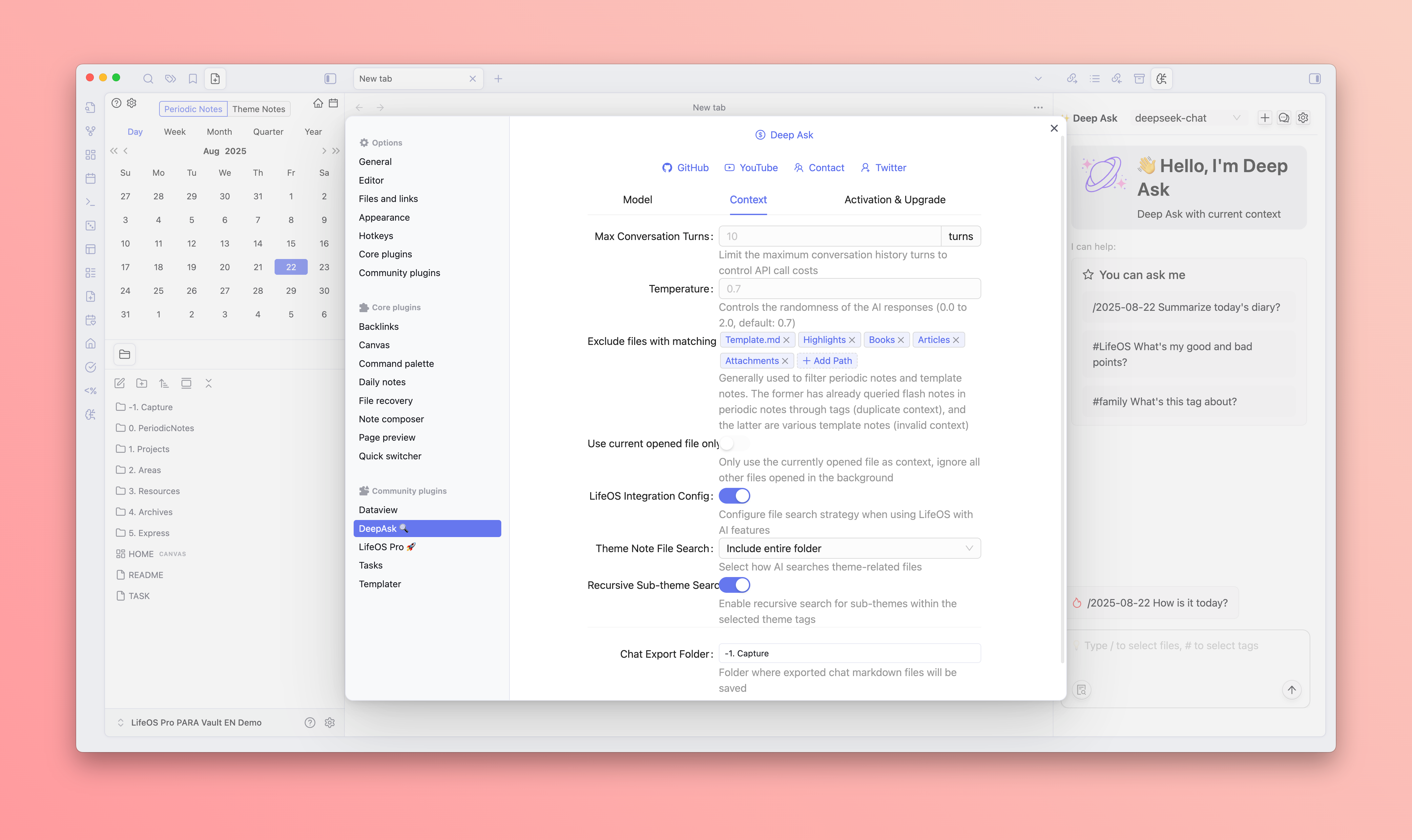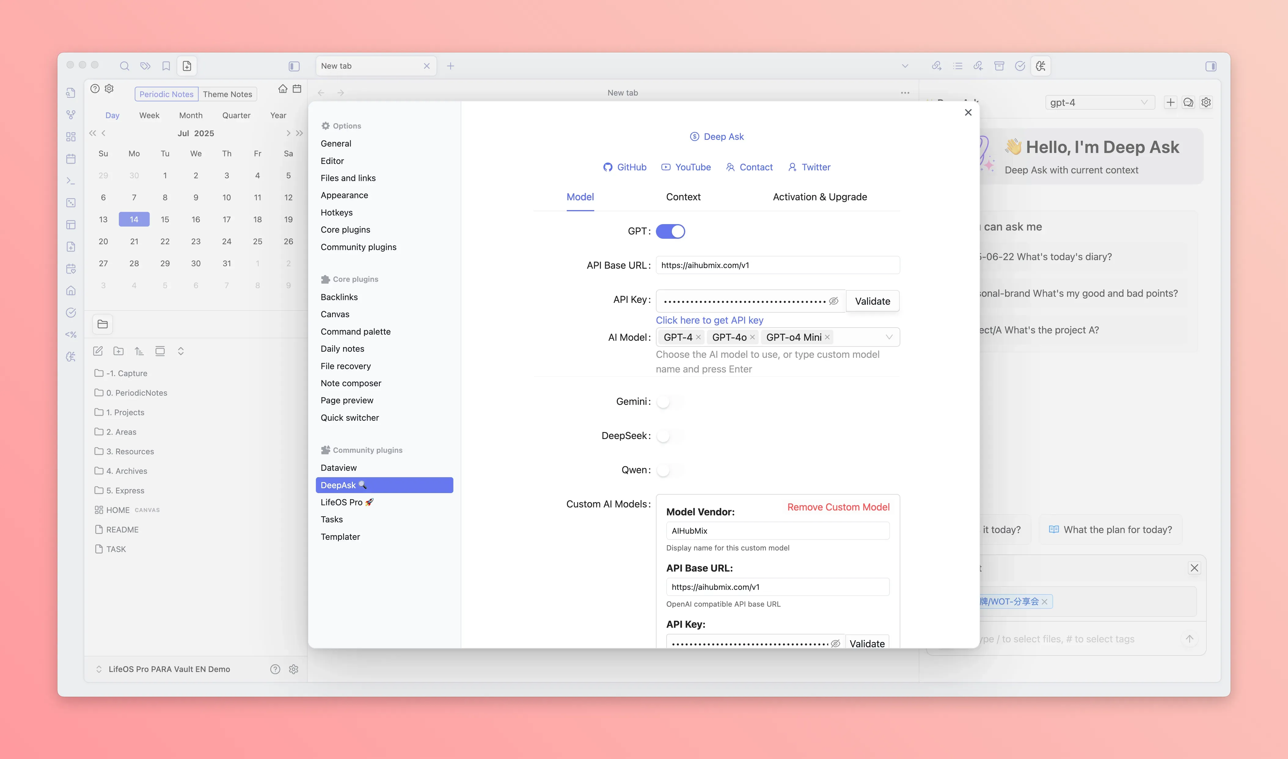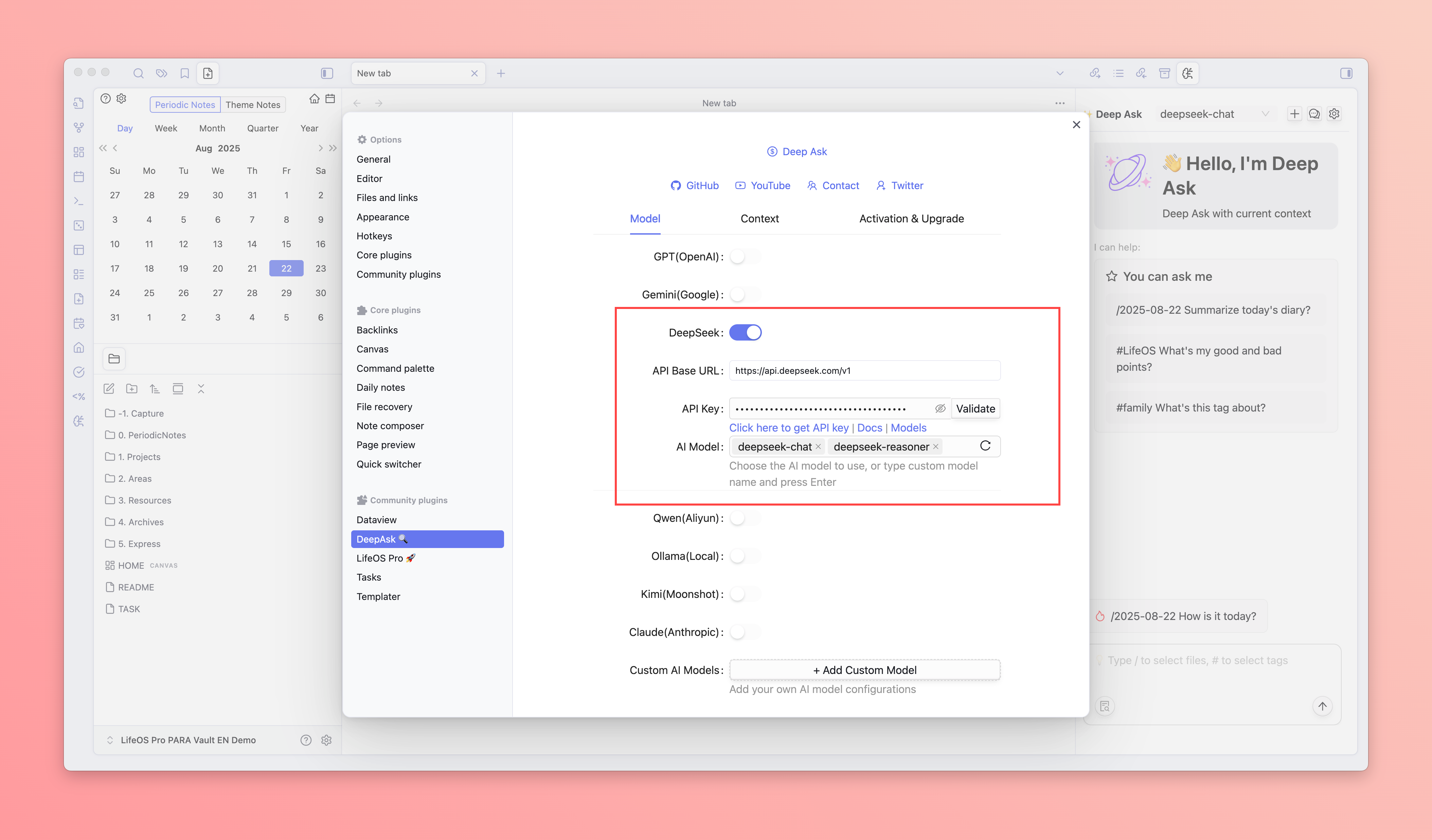 Deep Ask is a powerful Obsidian AI chat plugin designed to enhance your knowledge management experience. By integrating multiple AI models, Deep Ask can understand your note content, providing intelligent question-answering, content generation, and knowledge retrieval.