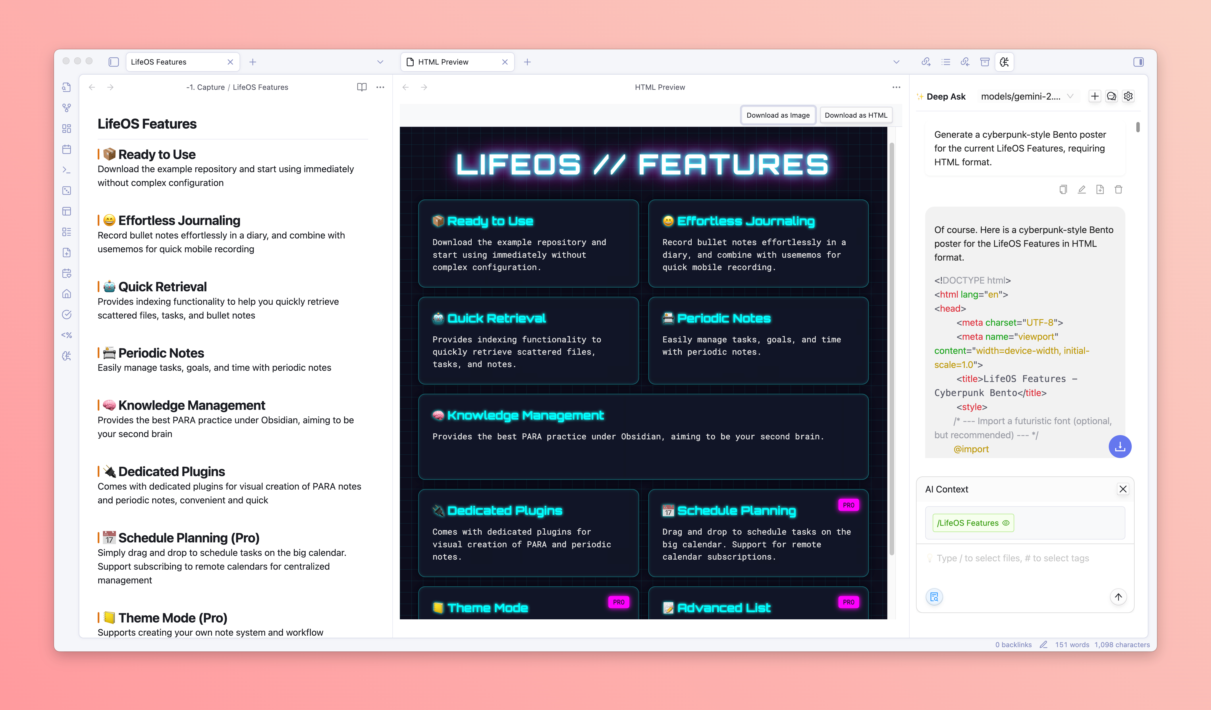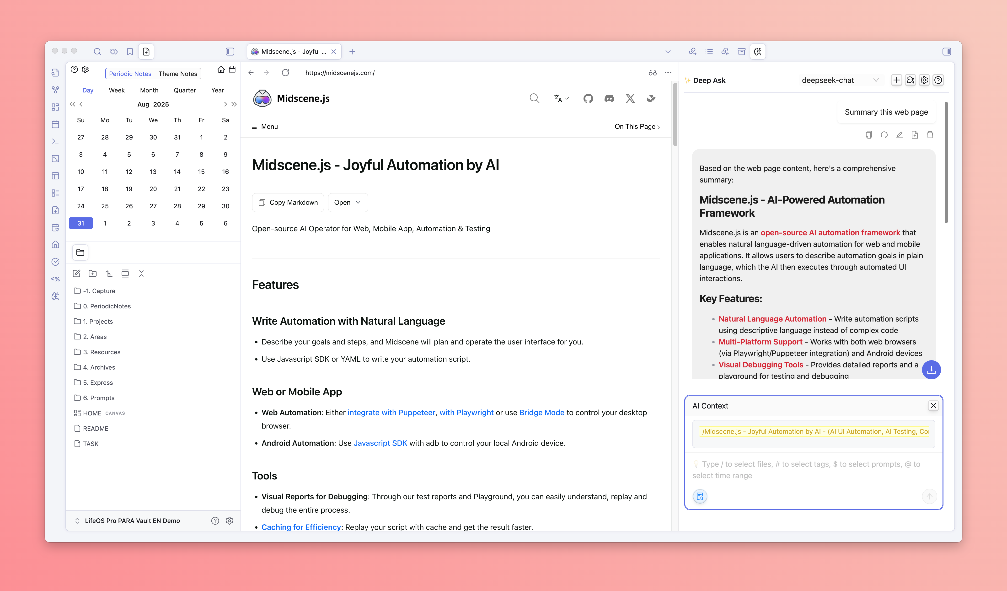 - Directly chat with the currently opened file and webpage, supporting multiple files and webpages as context, and linking with existing notes