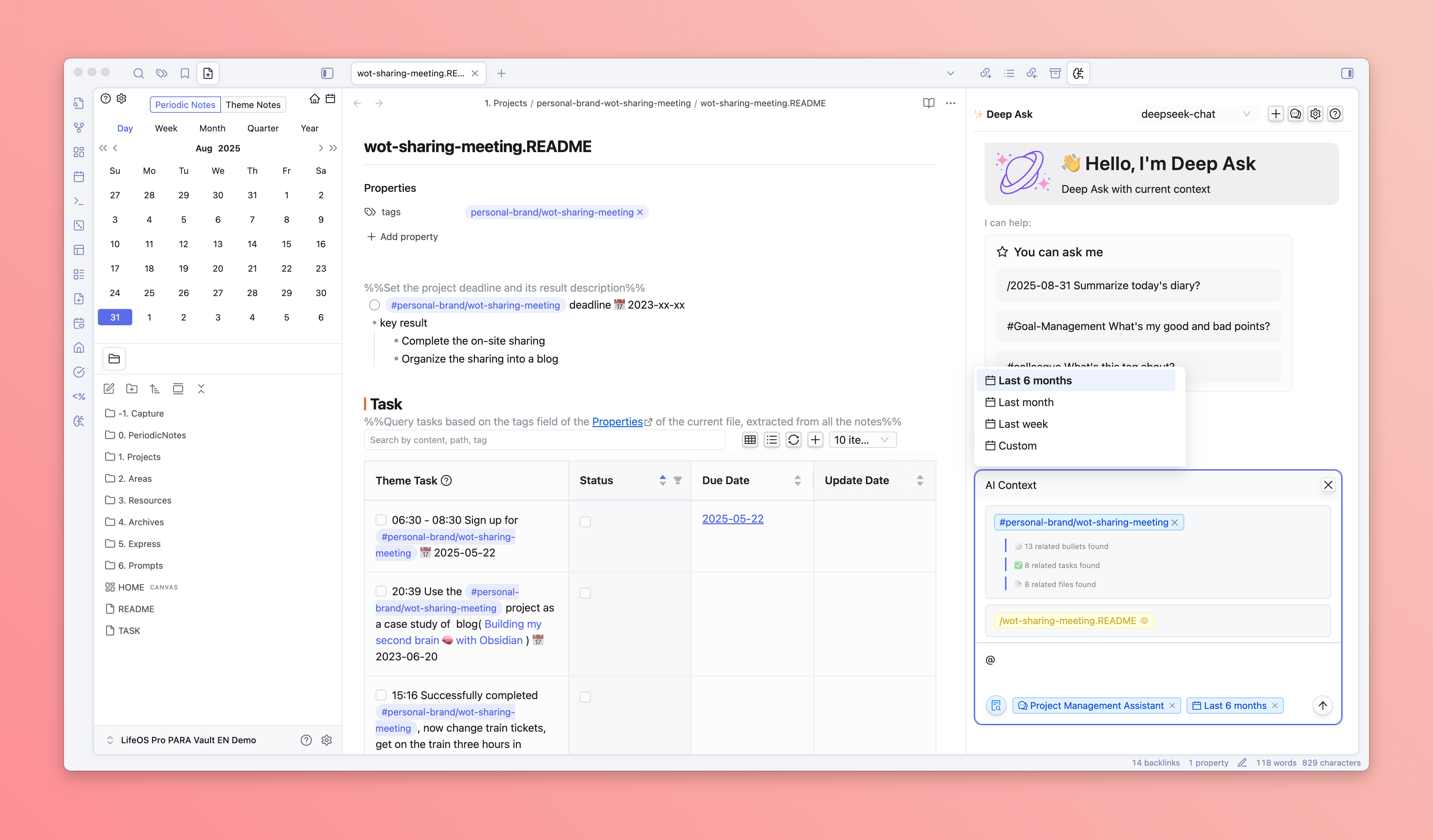 - DeepAsk will automatically limit all matching context (files, tags) to the specified time range