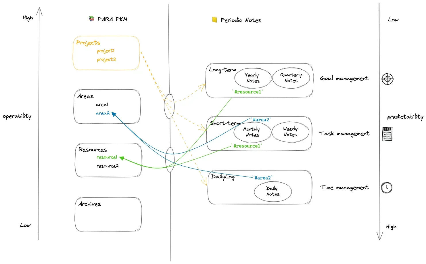 From Figure 1, we can find that for the theme note system, from "Archives", to "Resources", to "Areas", to "Projects", the operability of "Knowledge Notes" gets higher and higher. How to understand operability? For example, compared to what to do next in the "Parenting" area and what to do next in the "Parenting-Organizing Full Month Celebration" project, the latter obviously has more operability!