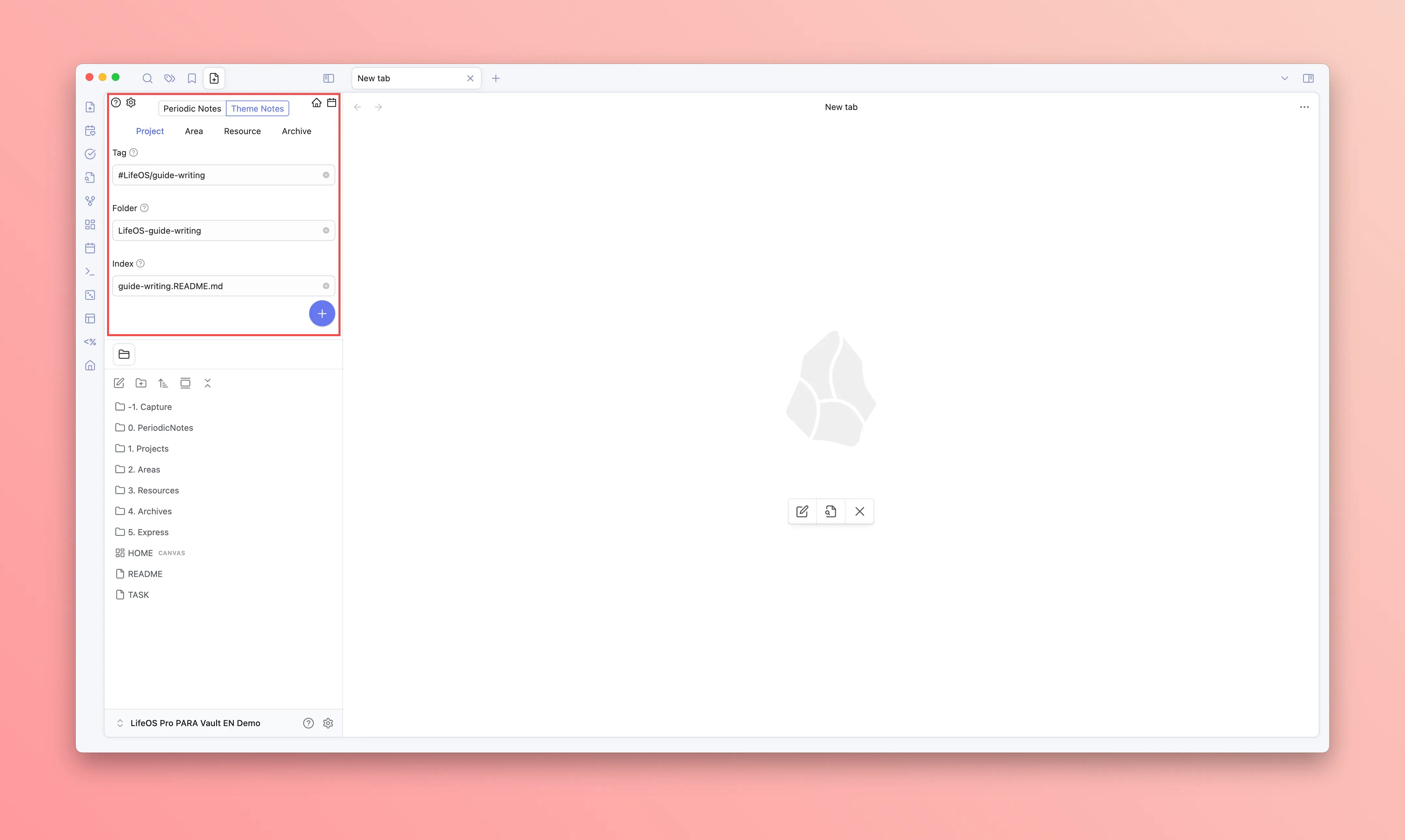 First, I opened Obsidian and created a "Personal Brand/LifeOS-Tutorial-Writing" project through the "Theme Notes" form in the upper left corner, where "Personal Brand" is the "Area";