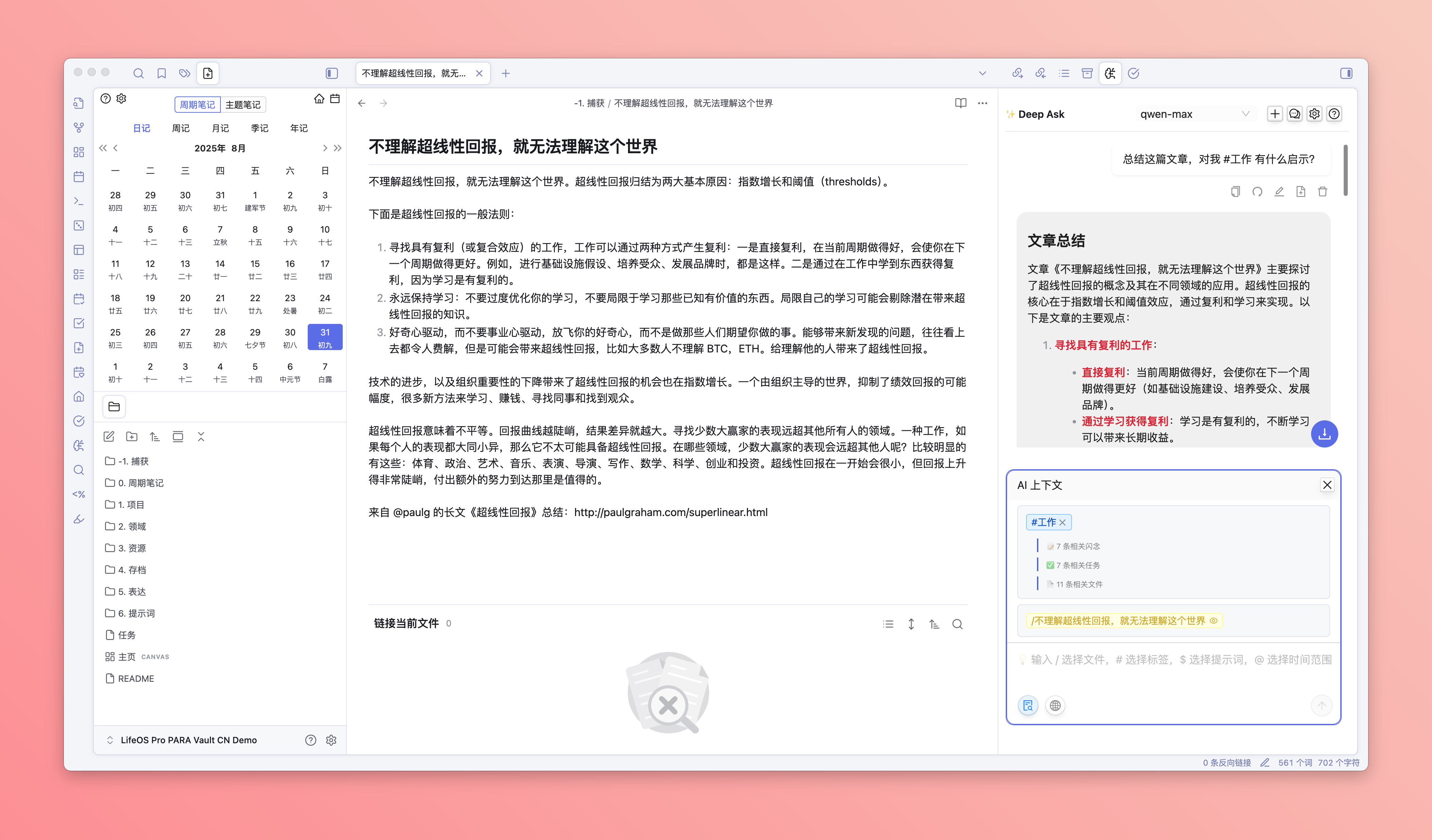 - 组织知识结构:建立清晰的文件夹和标签体系,方便 AI 检索