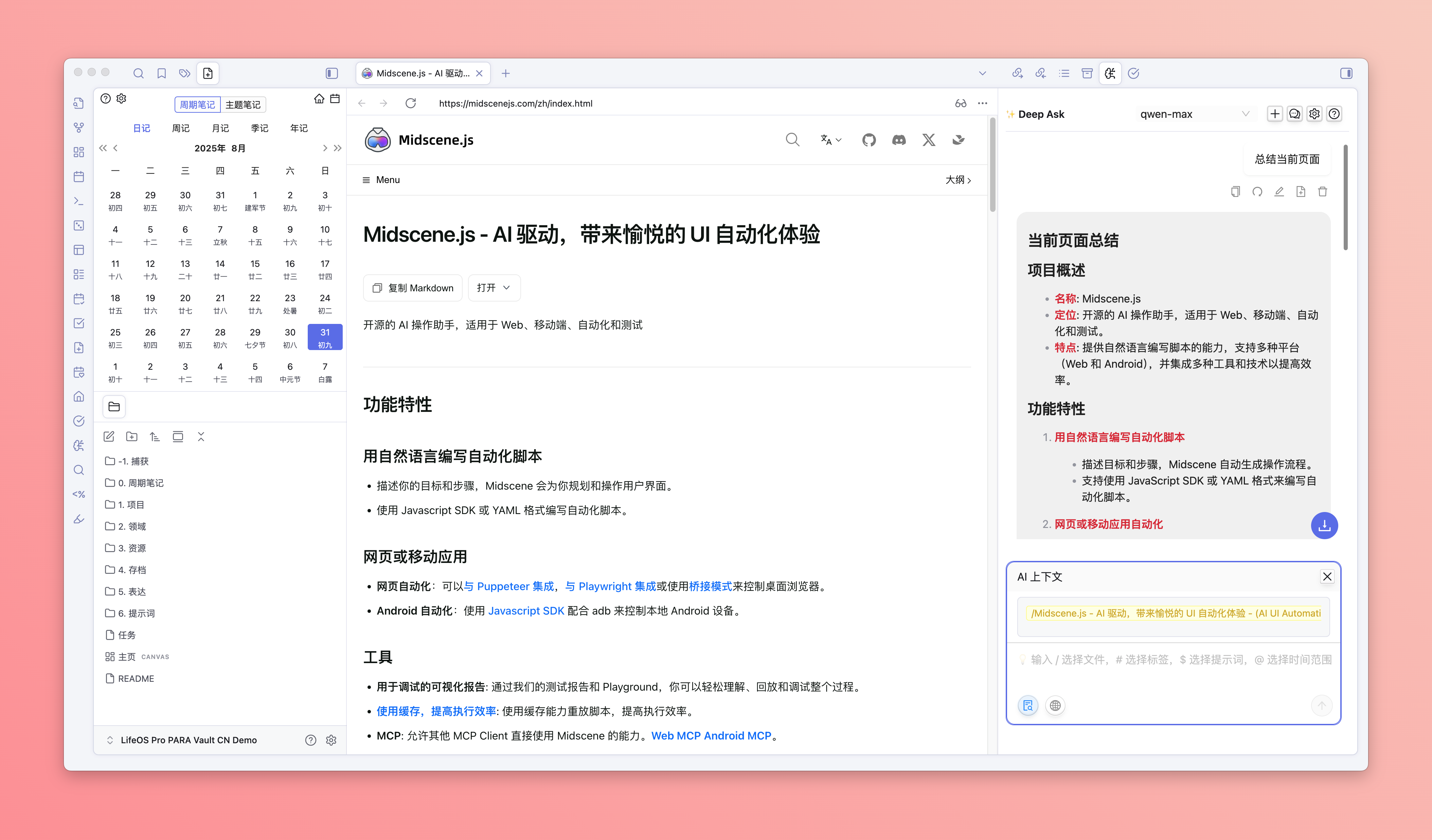 - 💻 实时内容对话:自动理解您的笔记结构和内容,支持与当前笔记和网页对话