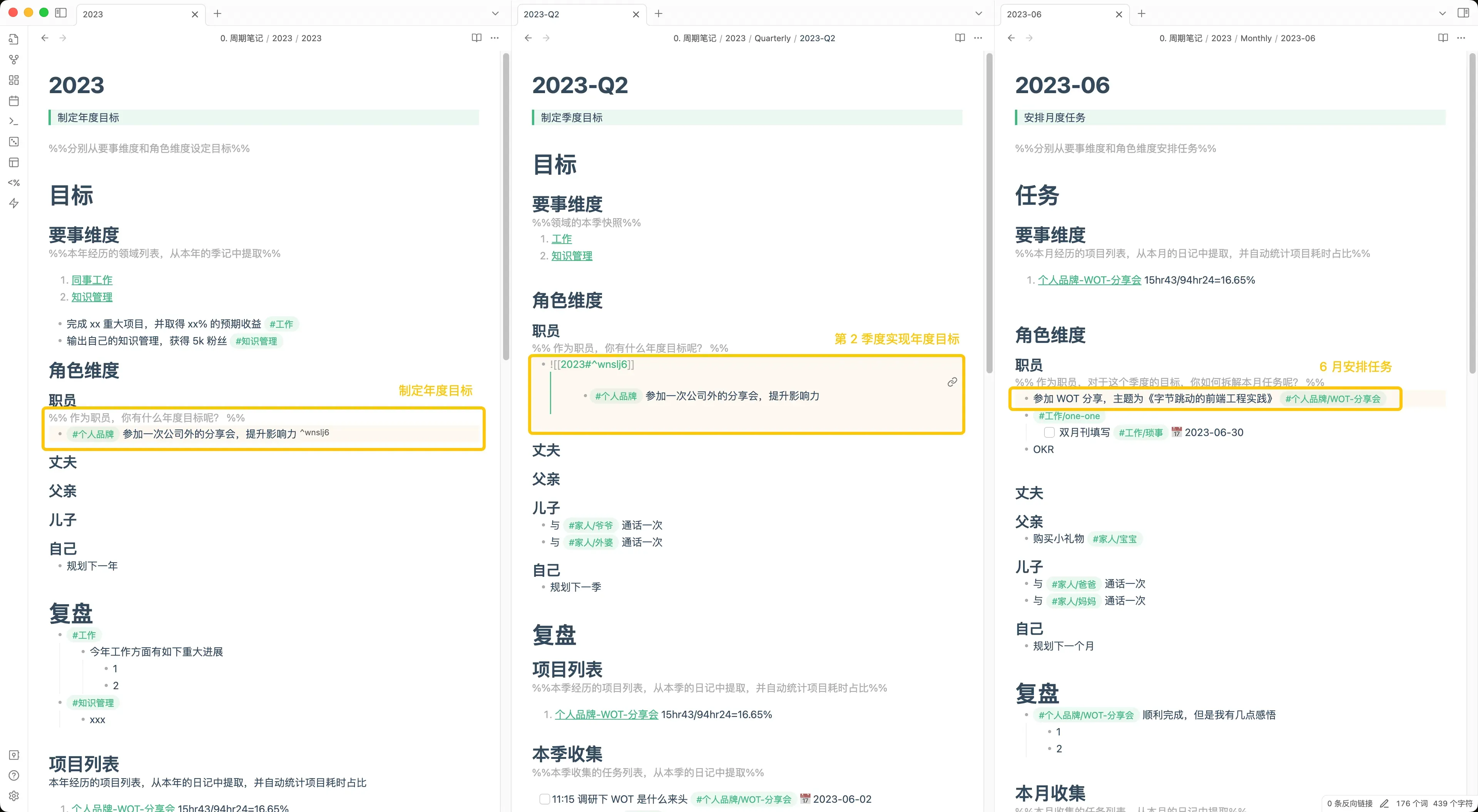 在每年开始的时候,通过『年记』规划年度目标,你可以从要事维度(即『领域』),也可以通过角色维度进行,这样能方便你在每个『领域』和『角色』都能保持目标感。