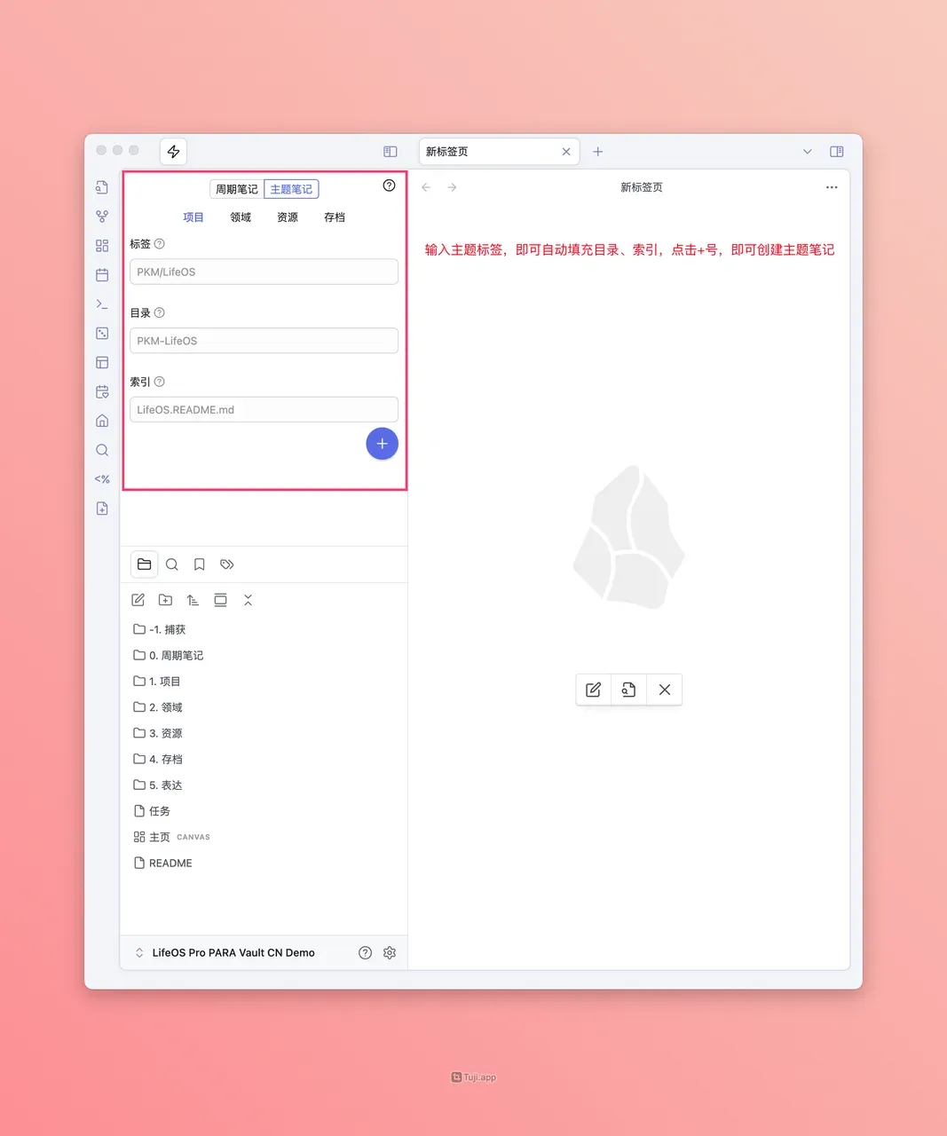 在左上角的表单(如果表单不存在,请点击左侧栏带+号的小图标,即可唤出),切换到主题笔记表单,输入『主题标签』,即可创建!创建后就会跳转到『主题索引文件』,每个主题索引文件,都有自己的三个『高级列表』,它用来索引散落在整个仓库中『被打上当前主题标签』的『主题任务』、『主题闪念』、『主题文件』!