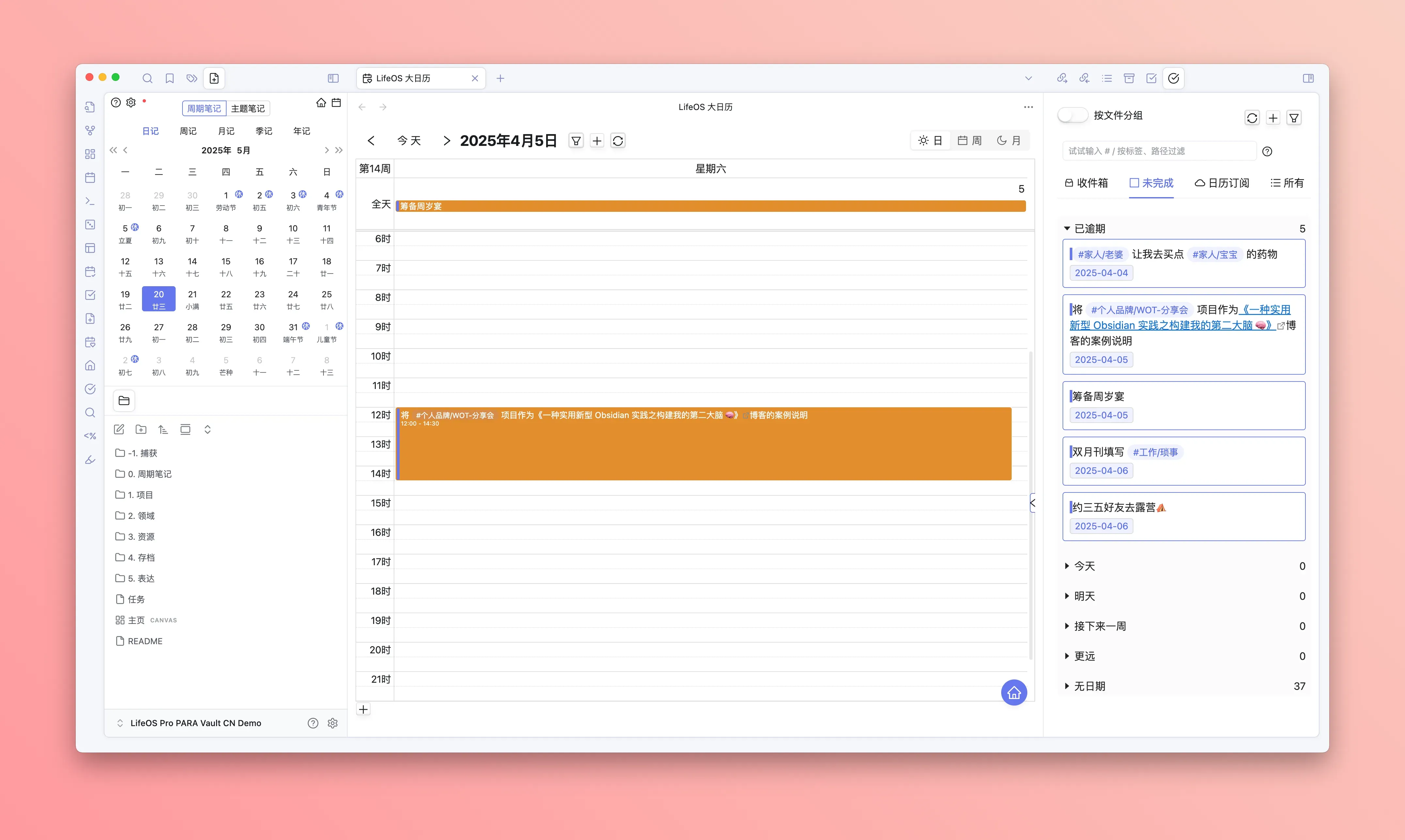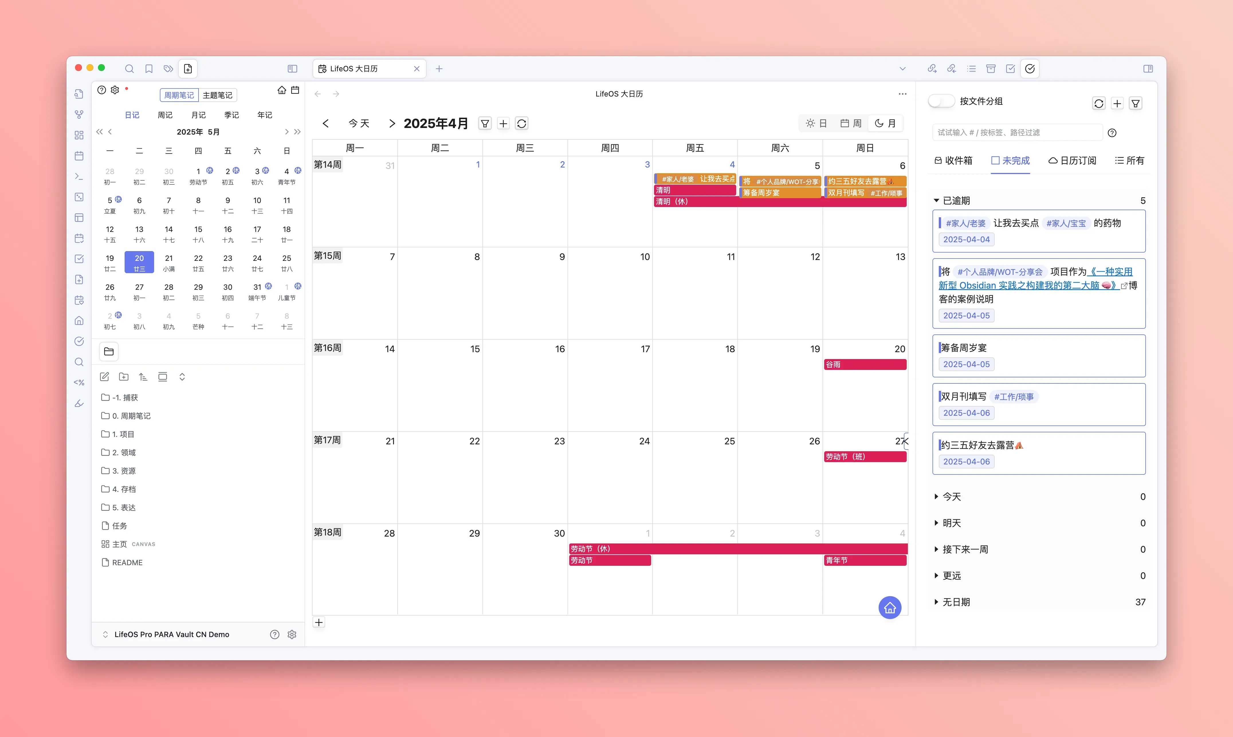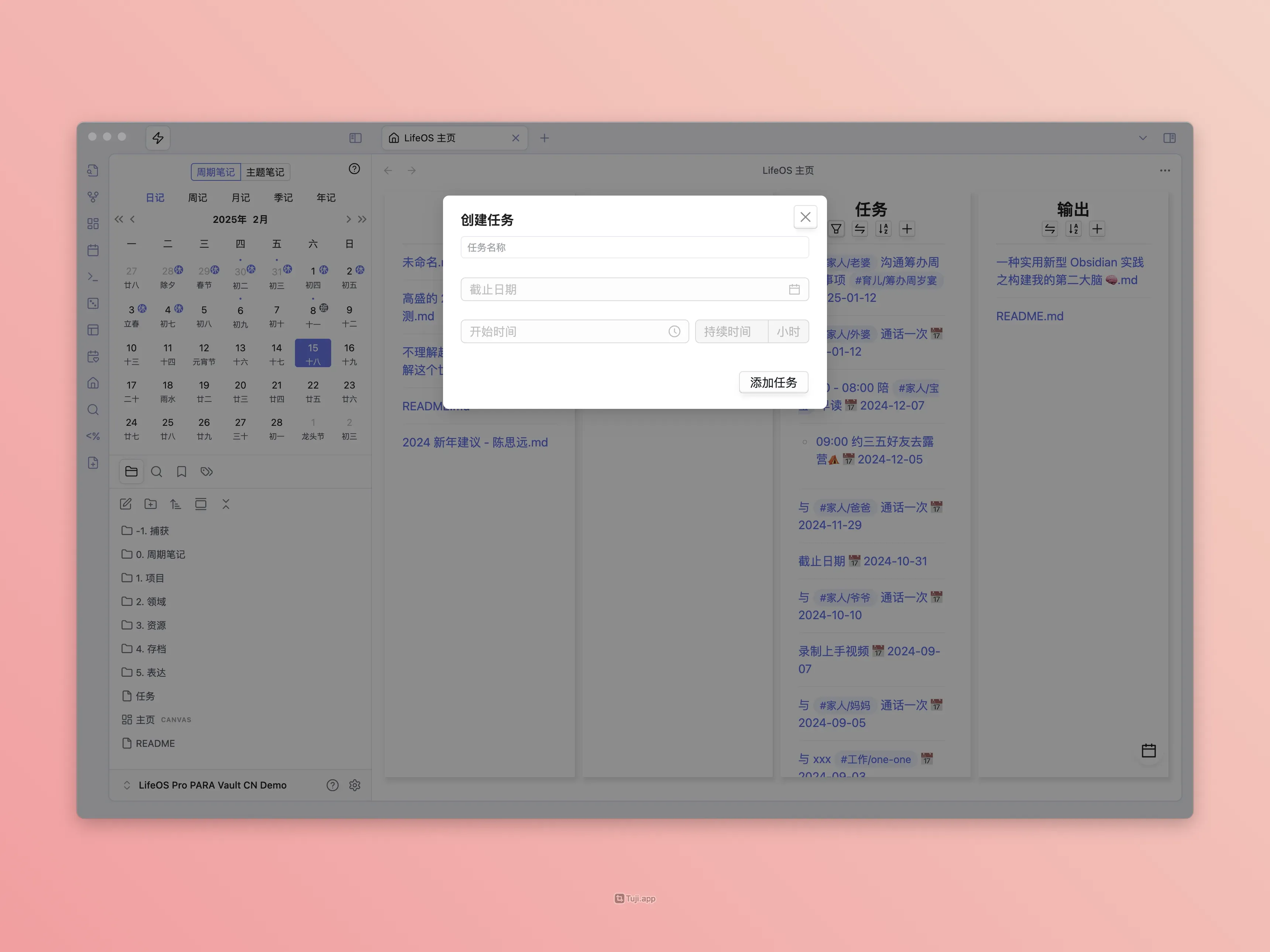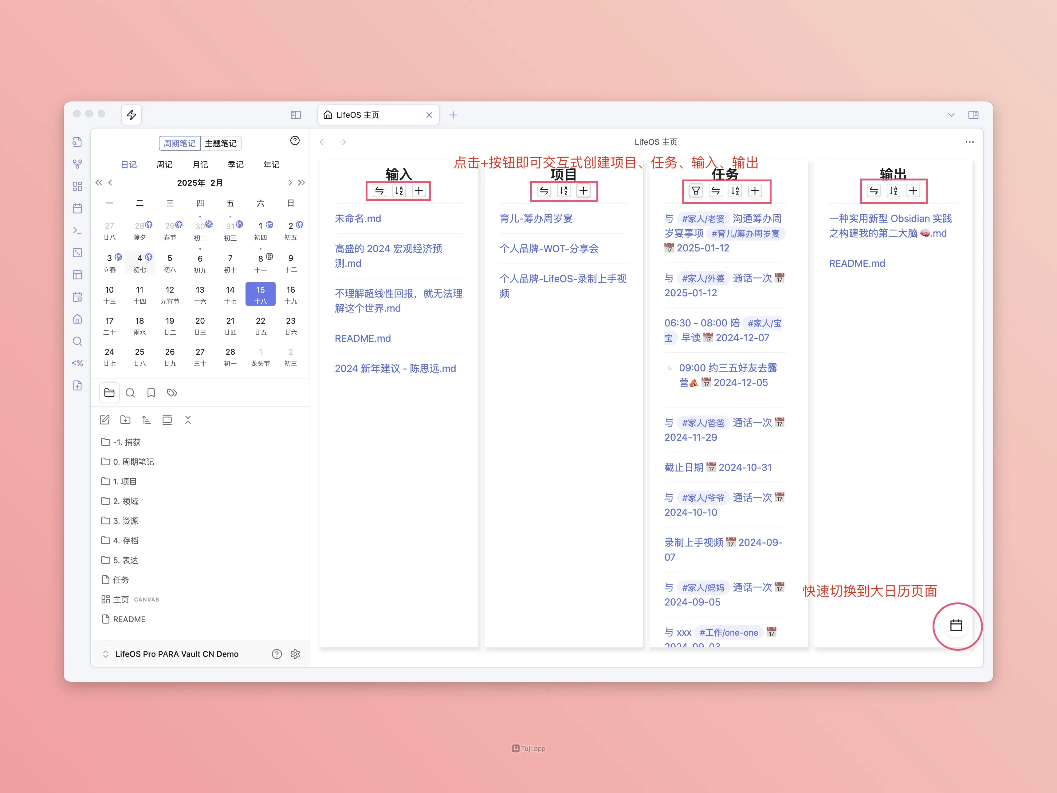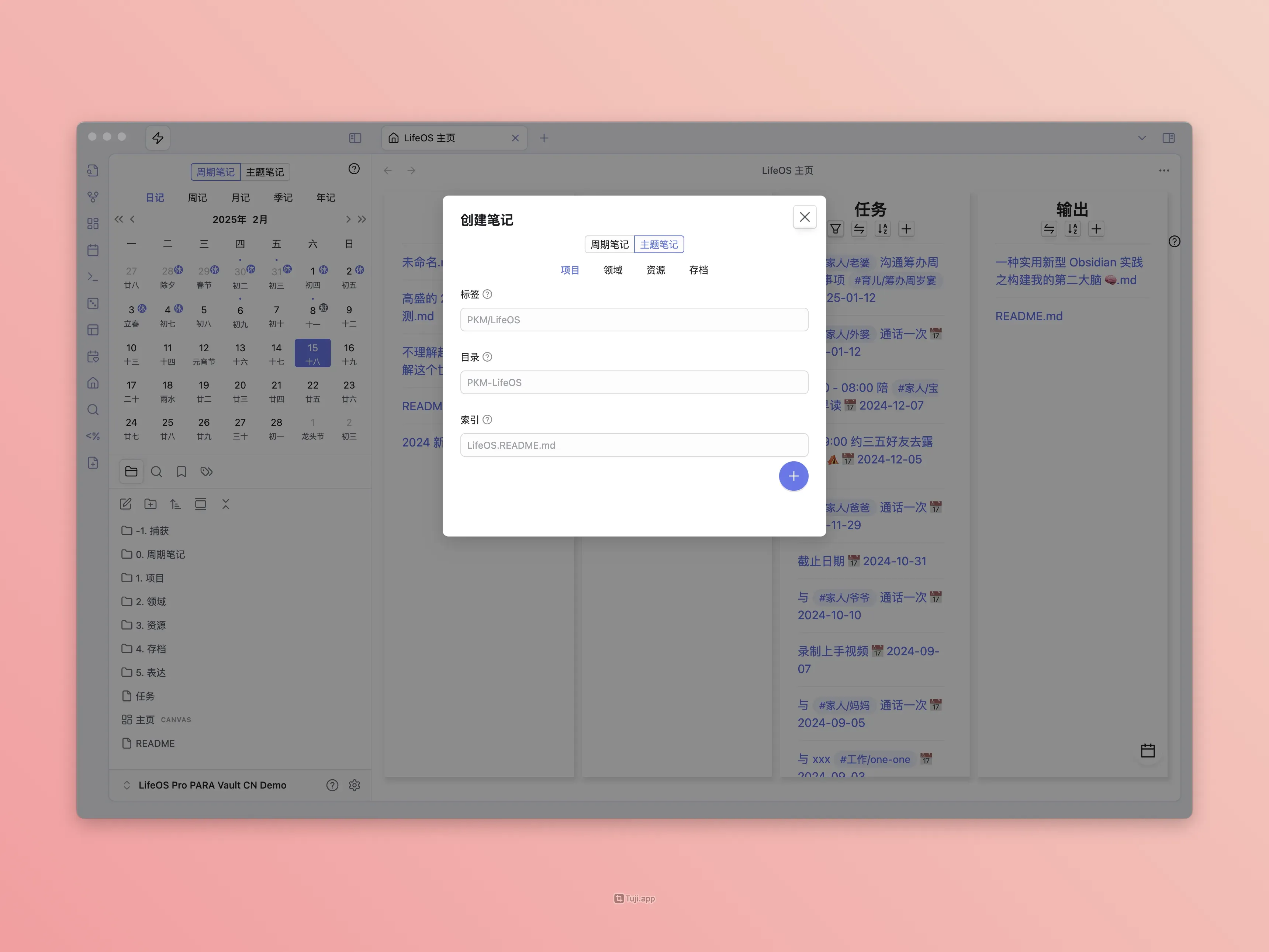 LifeOS 旨在成为你的生活系统,新版首页简洁实用,让你一目了然地掌握系统的输入、项目(主题)、任务和输出情况,帮你更好地统筹生活和工作。